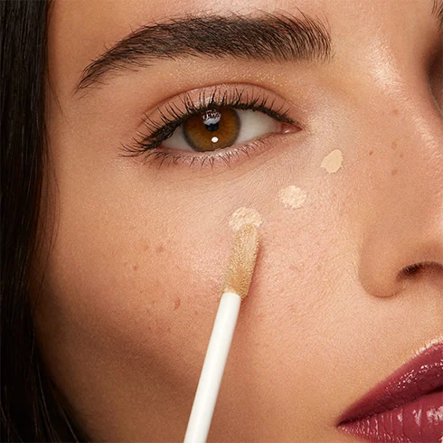 Camouflage blemishes by dabbing and thoroughly blending the shade of Full Coverage Dark Circles Concealer that best suits your skin to the eye contour area.